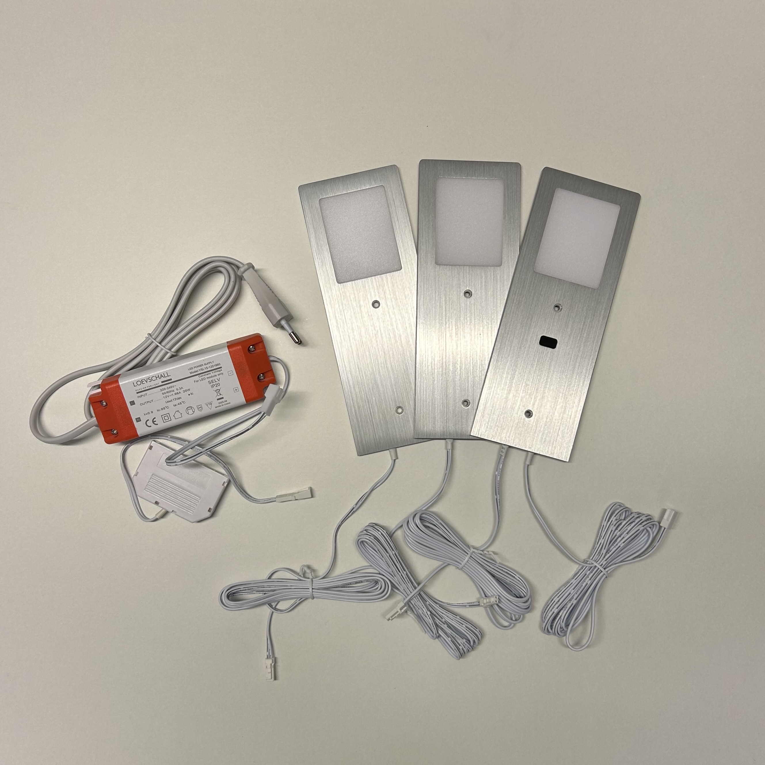 Flaches Aluminiumprofil mit LED-Beleuchtung und integriertem IR-Sensor. Elegante, integrierte Lösung ohne Vorbohren. Komplettes Set zur Montage unter Wandschränken oder Regalen.